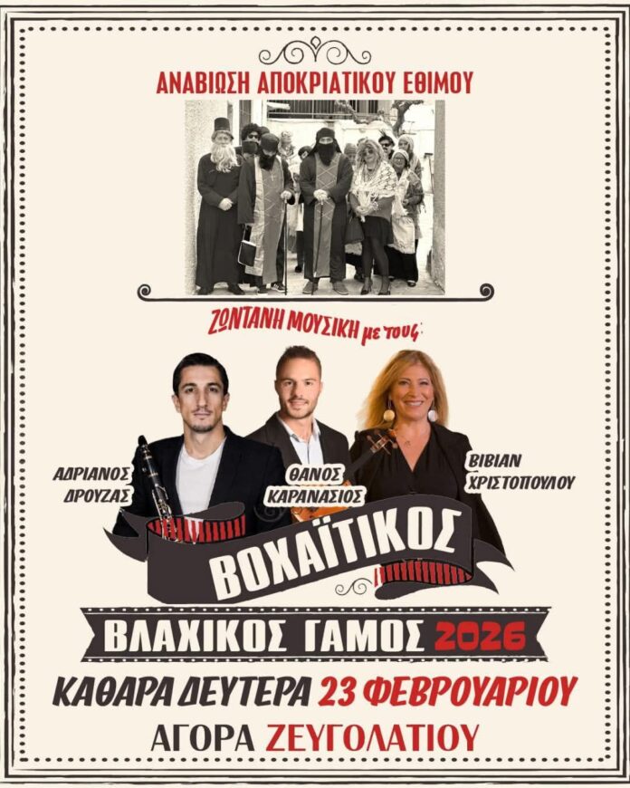 Με ενθουσιασμό και αμέριστη διάθεση συνεργασίας, η Κοινότητα Ζευγολατιού και οι συμμετέχοντες φορείς προετοιμάζονται για την κορύφωση του αγαπημένου αποκριάτικου δρώμενου: του Βοχαΐτικου Βλάχικου Γάμου.