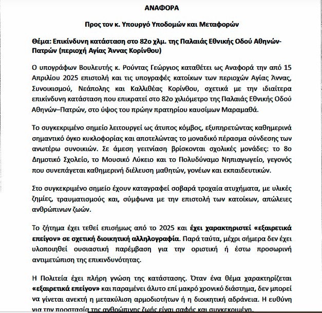 Αναφορά προς τον Υπουργό Υποδομών και Μεταφορών κατέθεσε ο Βουλευτής της ΝΙΚΗΣ, Γεώργιος Ρούντας, φέρνοντας στη Βουλή το σοβαρό ζήτημα οδικής ασφάλειας στο 82ο χιλιόμετρο της Παλαιάς Εθνικής Οδού Αθηνών-Πατρών, στο ύψος της Αγίας Άννας Κορίνθου.
