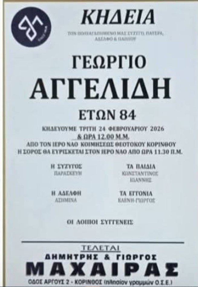 Η εξόδιος ακολουθία θα γίνει αύριο στον Συνοικισμό της Κορίνθου στον Ιερό Ναό Κοιμήσεως της Θεοτόκου στις 12μμ.