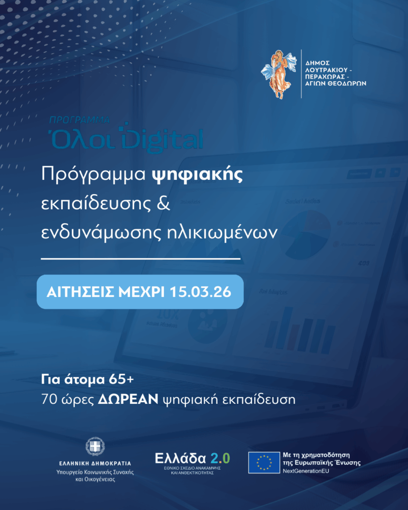 Λουτράκι: Ξεκίνησαν οι αιτήσεις για το Νέο Πρόγραμμα Ψηφιακής Εκπαίδευσης & Ενδυνάμωσης Ηλικιωμένων στον Δήμο μας