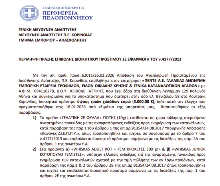 Κυριότερες Τοπικές ειδήσειςΤΟΠΙΚΑΛουτράκι ΛΟΥΤΡΑΚΙ: Το πρόστιμο που επιβλήθηκε στο σούπερ μάρκετ “Γαλαξίας”! -Τι διαπιστώθηκε… 5 Μαρτίου 2026, 09:09 FacebookTwitterEmailCopy URLΤυπώνω - Advertisement - Η απόφαση: korinthiannews.gr - Advertisement - ΕΤΙΚΕΤΕΣΓΑΛΑΞΙΑΣΠΡΟΣΤΙΜΟΣΟΥΠΕΡ ΜΑΡΚΕΤλΟΥΤΡΑΚΙ ΑΦΗΣΤΕ ΜΙΑ ΑΠΑΝΤΗΣΗ Ακύρωση απάντησης Σχόλιο: εισάγετε το σχόλιό σας! Όνομα: παρακαλώ εισάγετε το όνομά σας εδώ Email: έχετε εισάγει εσφαλμένη διεύθυνση ηλεκτρονικού ταχυδρομείου! παρακαλώ εισάγετε εδώ την ηλεκτρονική σας διεύθυνση Ιστοσελίδα: αποθηκεύστε το όνομα, το ηλεκτρονικό ταχυδρομείο και τον ιστότοπό μου σε αυτό το πρόγραμμα περιήγησης για την επόμενη φορά που θα σχολιάσω. Δ Δείτε ακόμα Λουτράκι Mαντέψτε! Διαφήμιση της ΔΕΥΑ Λουτρακίου στην τηλεόραση και το ραδιόφωνο Λουτράκι Δύο συνεδριάσεις ετησίως της δημοτικής Κοινότητας στην ιστορική Περαχώρα Λουτράκι O Πολιτιστικός Σύλλογος Περαχώρας υποδέχθηκε μαθητές και καθηγητές Λουτράκι ‘Υποπτος για παράβαση καθήκοντος ο δήμαρχος Γιώργος Γκιώνης ΥΓΕΙΑ Ιατρικός Σύλλογος Κορινθίας: «Παγκόσμια Ημέρα κατά της παχυσαρκίας» Σχετικά άρθρα Λουτράκι Mαντέψτε! Διαφήμιση της ΔΕΥΑ Λουτρακίου στην τηλεόραση και το ραδιόφωνο Λουτράκι Δύο συνεδριάσεις ετησίως της δημοτικής Κοινότητας στην ιστορική Περαχώρα Λουτράκι O Πολιτιστικός Σύλλογος Περαχώρας υποδέχθηκε μαθητές και καθηγητές Λουτράκι ‘Υποπτος για παράβαση καθήκοντος ο δήμαρχος Γιώργος Γκιώνης