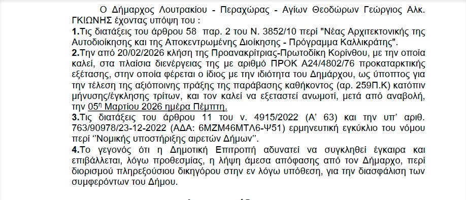 Ενώπιον της ανακρίτριας-Πρωτοδίκου Κορίνθου, οδηγείται σήμερα 5 Μαρτίου, μαζί με διοικητικό στέλεχος του δήμου (Υποπτος για παράβαση καθήκοντος διοικητικό στέλεχος του Δήμου), ο δήμαρχος Λουτρακίου Γιώργος Γκιώνης στο πλαίσιο διενέργειας προκαταρκτικής εξέτασης σε υπόθεση που φέρεται ως ύποπτος για την τέλεση της αξιόποινης πράξης της παράβασης του καθήκοντος, κατόπιν μήνυσης πολιτών.