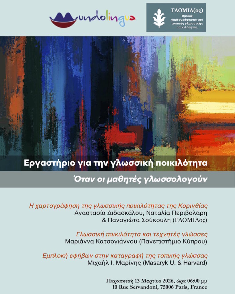 Αφορμή αποτελεί το «Εργαστήριο για την γλωσσική ποικιλότητα» με τίτλο «Όταν οι μαθητές γλωσσολογούν», το οποίο διοργανώνει ο «Όμιλος ανάδειξης, καταγραφής και χαρτογράφησης της τοπικής γλωσσικής ποικιλότητας – ΓΛΟΜΙΛ(ος)».