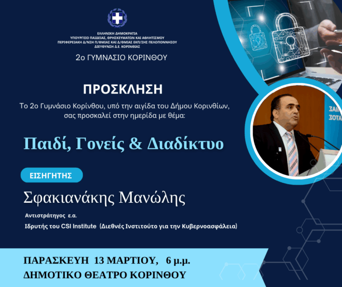 Στο πλαίσιο των δράσεων ενημέρωσης και ευαισθητοποίησης κατά της βίας, το 2ο Γυμνάσιο Κορίνθου   διοργανώνει ομιλία με θέμα «Παιδιά – γονείς και διαδίκτυο», την Παρασκευή 13 Μαρτίου 2026 και ώρα 18:00, στο Δημοτικό Θέατρο Κορίνθου. Κεντρικός ομιλητής θα είναι ο κ. Μανώλης Σφακιανάκης, αντιστράτηγος ε.α. και ιδρυτής του Διεθνούς  Ινστιτούτου Κυβερνοασφάλειας..