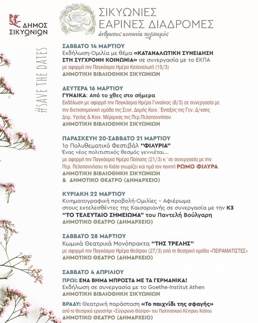 Ο Δήμος Σικυωνίων σάς προσκαλεί σε μια μοναδική περιήγηση στον πολιτισμό, την κοινωνία και τα γράμματα, με φόντο την άνοιξη που έφτασε! Από μέσα Μαρτίου έως το Πάσχα, η Δημοτική Βιβλιοθήκη και το Δημοτικό Θέατρο γίνονται σταθμοί για συναντήσεις που εμπνέουν.