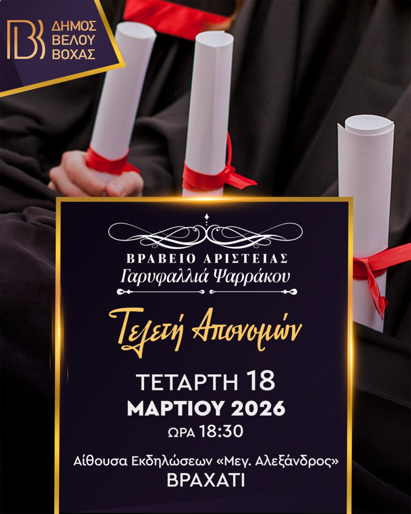 Ο Δήμος Βέλου-Βόχας μετατρέπει την Τετάρτη 18 Μαρτίου 2026 σε μια ημέρα βαθιάς κοινωνικής ουσίας και συμβολισμού. Στην αίθουσα εκδηλώσεων «Μέγας Αλέξανδρος» στο Βραχάτι, η τοπική μας κοινωνία θα συναντηθεί για να τιμήσει τους αριστούχους της νεολαίας μας, αλλά και να αναμετρηθεί με τις δύσκολες προκλήσεις της σύγχρονης πραγματικότητας.