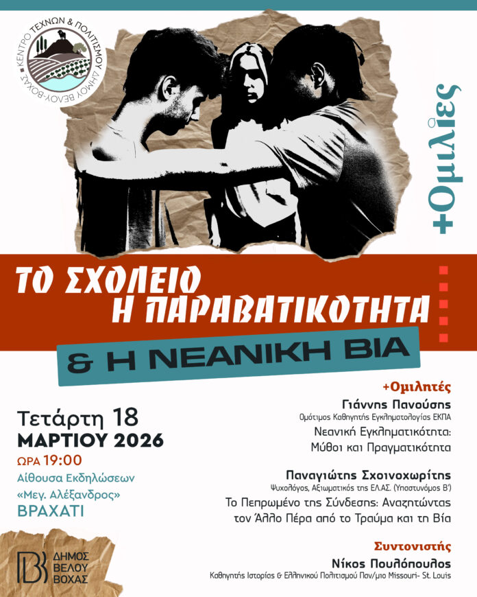 Ο Δήμος Βέλου-Βόχας προσκαλεί όλους τους δημότες, τους εκπροσώπους της εκπαιδευτικής κοινότητας και τους φορείς της περιοχής να δώσουν το «παρών» σε μια βραδιά διαλόγου, προβληματισμού και κοινωνικής ευαισθητοποίησης.