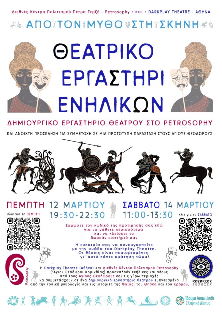 Η Darkplay Theatre (Αθήνα) και το Διεθνές Κέντρο Πολιτισμού Petrosophy (Άγιοι Θεόδωροι) προσκαλoύν ενήλικες και νέους από τους Αγίους Θεοδώρους και τις γύρω περιοχές να συμμετάσχουν σε ένα δημιουργικό εργαστήριο θεάτρου εμπνευσμένο από την τοπική μυθολογία και τις ιστορίες της Φαίας, του Θησέα και του Κρόμου.