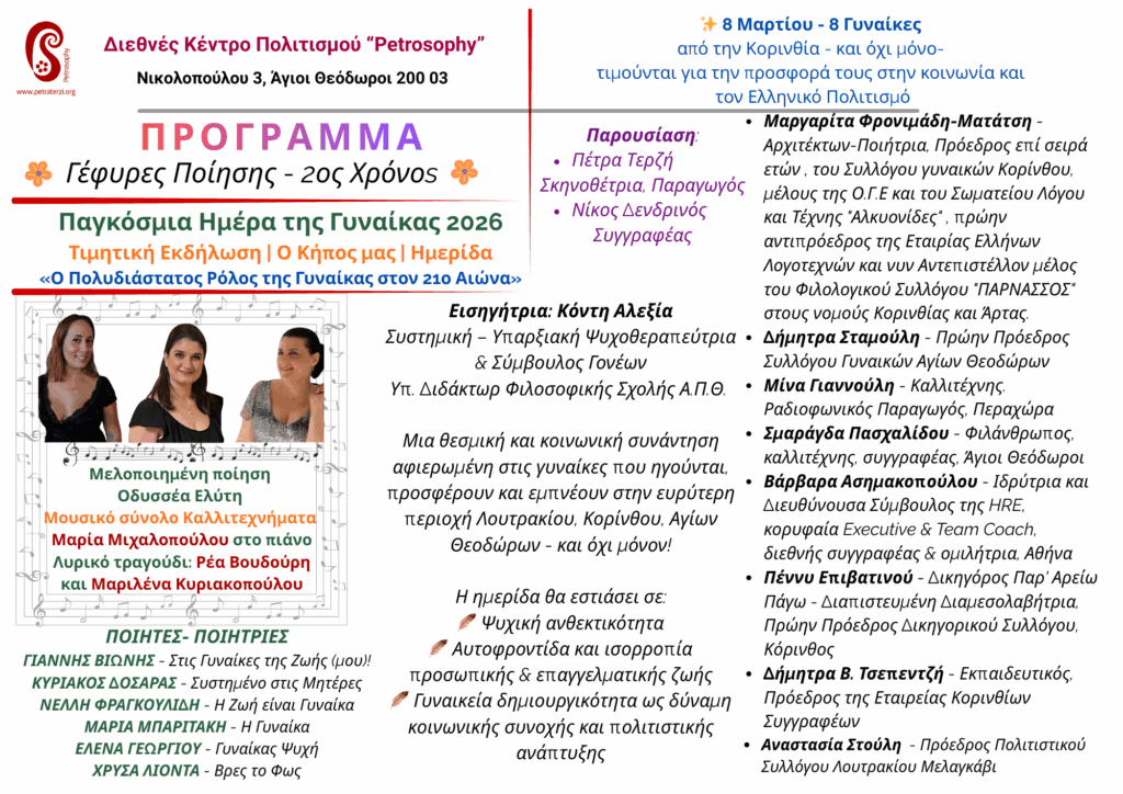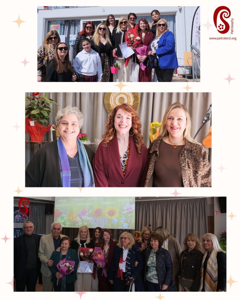 Το Διεθνές Κέντρο Πολιτισμού “Petrosophy” των Αγ. Θεοδώρων με την επικεφαλής του καλλιτέχνιδα Πέτρα Τερζή, τίμησε δεόντως σήμερα το πρωί την 8η Μάρτη, Παγκόσμια Μέρα της Γυναίκας δίνοντας βήμα και τιμώντας οκτώ γυναίκες του νομού Κορινθίας με έντονη και πολύχρονη δράση στο γυναικείο κίνημα και στον χώρο του Πολιτισμού.