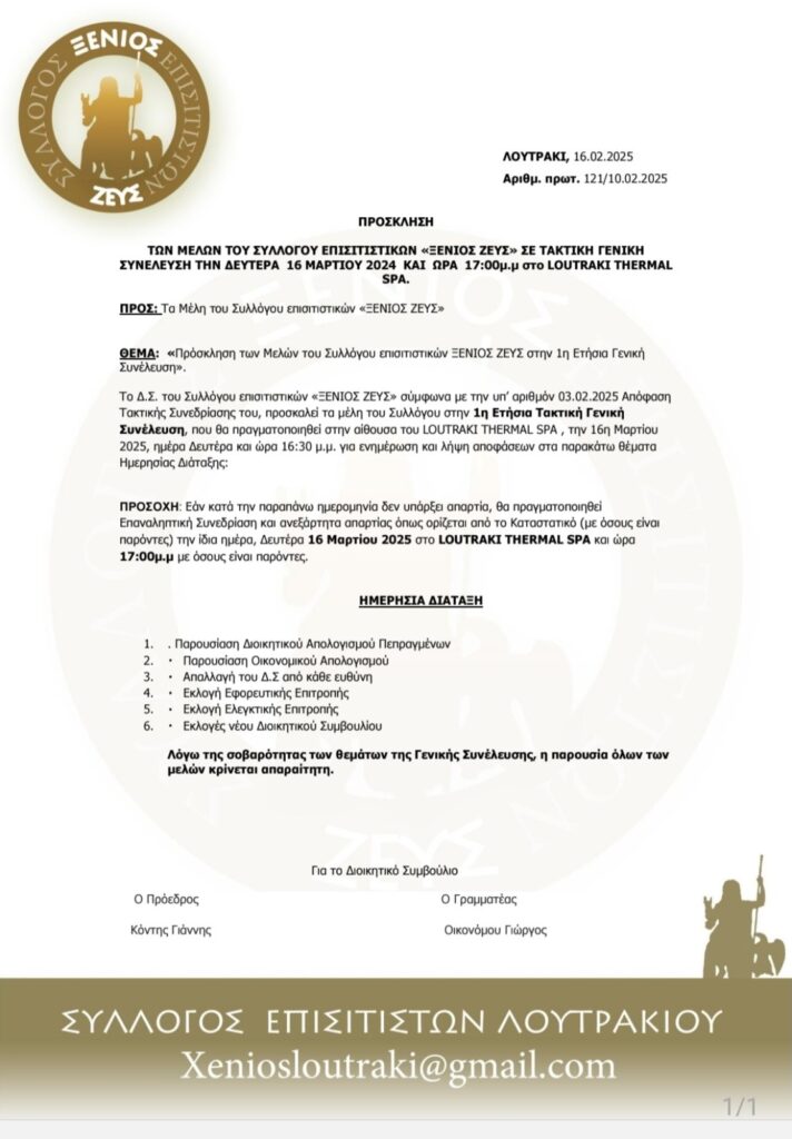 Τη Δευτέρα 16 Μαρτίου 2026 και ώρα 16:30 θα πραγματοποιηθούν οι εκλογές στον Σύλλογο Επισιτιστών Λουτρακίου «Ο Ξένιος Ζευς» για την ανάδειξη του νέου Διοικητικού Συμβουλίου. Πρόκειται για μια σημαντική διαδικασία που αφορά όλους τους επαγγελματίες του κλάδου και καθορίζει την πορεία και τη δυναμική του Συλλόγου για τα επόμενα χρόνια.