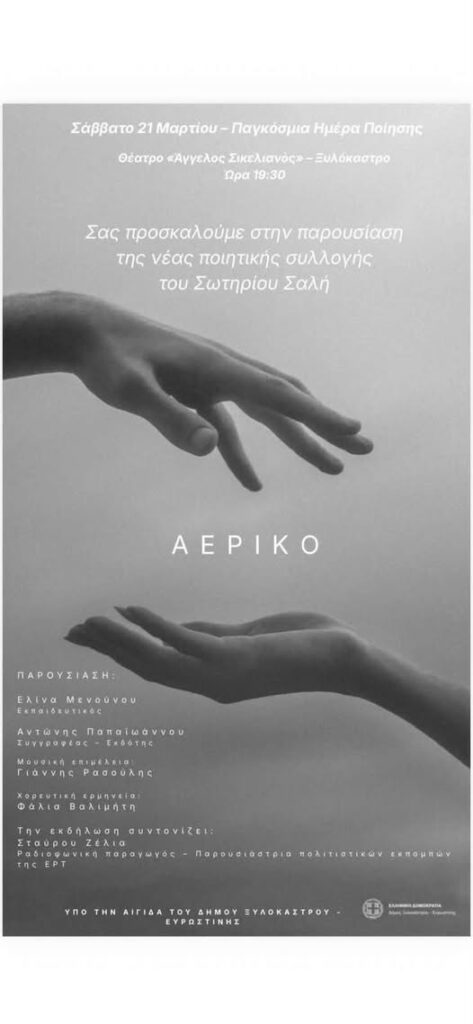 Ο Δήμος Ξυλοκάστρου – Ευρωστίνης σάς προσκαλεί το Σάββατο 21 Μαρτίου, ανήμερα της Παγκόσμιας Ημέρας Ποίησης, στην παρουσίαση της νέας ποιητικής συλλογής του Σωτηρίου Σαλή με τίτλο «ΑΕΡΙΚΟ».
