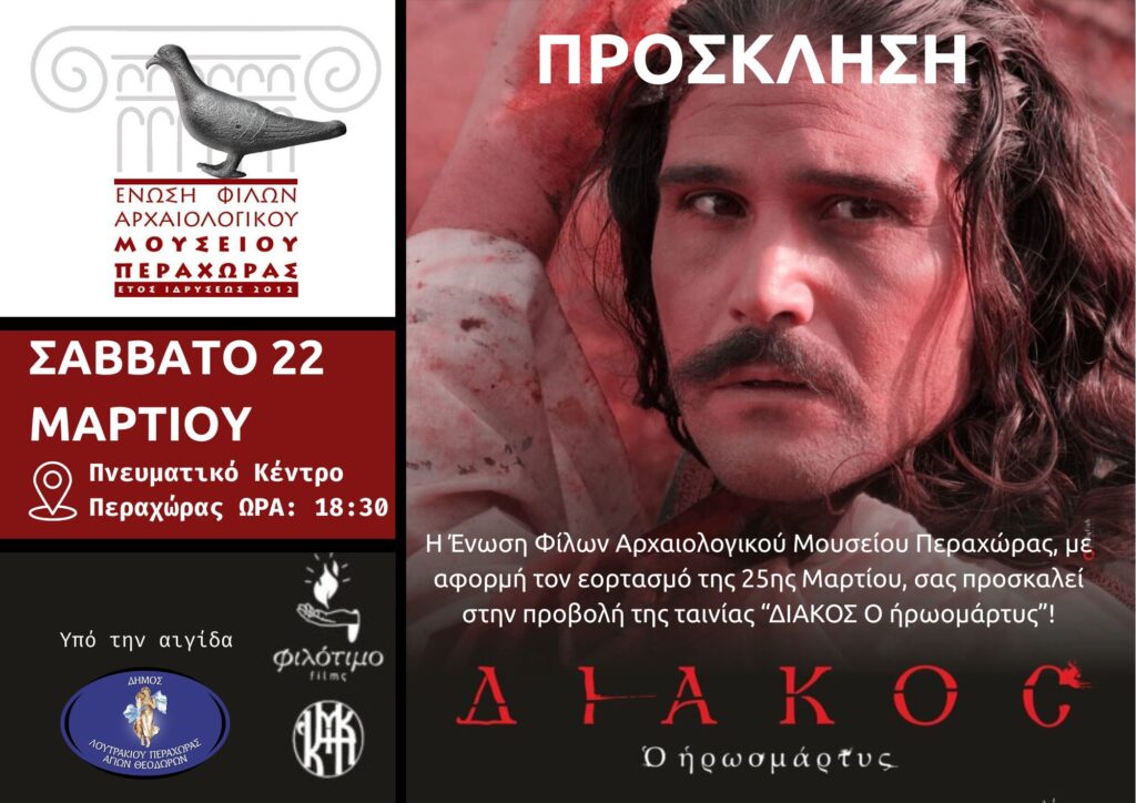 Η “Ένωση Φίλων Αρχαιολογικού Μουσείου Περαχώρας” σας προσκαλεί στην εκδήλωση που διοργανώνει στα πλαίσια του εορτασμού της εθνικής μας επετείου της 25ης Μαρτίου, το Σάββατο 21 Μαρτίου οπου θα προβληθεί η ταινία “Ο ΔΙΑΚΟΣ, Ο ΙΕΡΟΜΑΡΤΥΣ”, στο Πνευματικό Κέντρο Περαχώρας και ώρα 6:30 μ.μ..