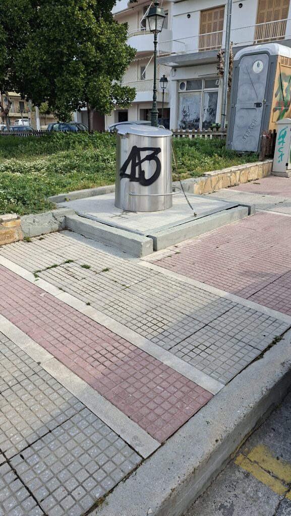 Αν περάσετε από την 28η Οκτωβρίου στο Λουτράκι, μην μπερδευτείτε και νομίσετε ότι ο αστραφτερός μεταλλικός κάδος είναι για χρήση. Είναι απλώς ένα διακοσμητικό στοιχείο με λουκέτο.