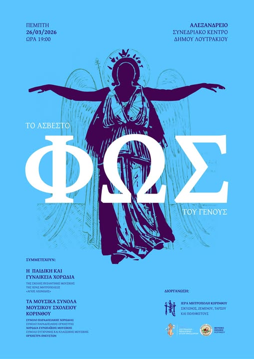 Η Ιερά Μητρόπολη Κορίνθου και το Μουσικό Σχολείο Κορίνθου σᾶς προσκαλοῦν στὴν ἐορταστικὴ–ἐπετειακὴ ἐκδήλωση «Τὸ Ἄσβεστο Φῶς τοῦ Γένους», ἡ ὁποία θὰ πραγματοποιηθεῖ τὴν Πέμπτη 26 Μαρτίου καὶ ὥρα 19:00, στὸ Αλεξάνδρειο Συνεδριακό Κέντρο του Δήμος Λουτρακίου – Περαχώρας – Αγίων Θεοδώρων.