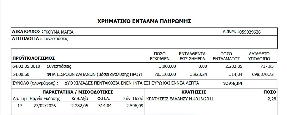 Σύμφωνα με το ένταλμα, το καθαρό ποσό της δαπάνης ανέρχεται σε 2.282,05 ευρώ και ο ΦΠΑ σε 314,04 ευρώ, με αιτιολογία απλώς τη λέξη «συνεστίαση», χωρίς να διευκρινίζεται ποιος ήταν ο σκοπός, ποιοι συμμετείχαν ή σε ποια εκδήλωση αφορά η συγκεκριμένη δαπάνη.