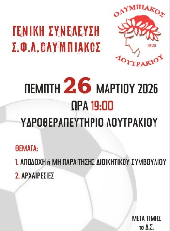 Στις 7μμ στο Υδροθεραπευτήριο(SPA) Λουτρακίου η γενική συνέλευση της ομάδος που το τελευταίο διάστημα μονοπώλησε το ενδιαφέρον της κοινής γνώμης με την πρόταση συγχώνευσης με την άλλη ομάδα της πόλης τον ΑΟΛ.