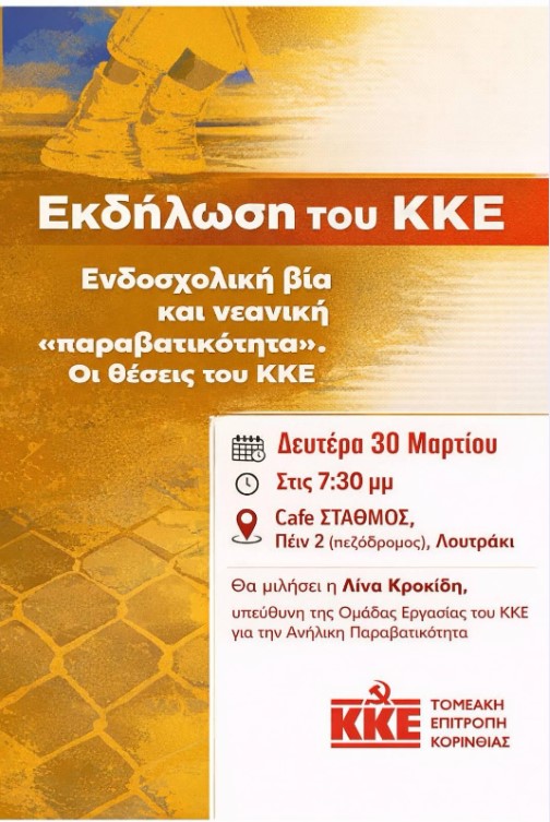 ΜΕ ΑΦΟΡΜΗ ΤΑ ΓΕΓΟΝΟΤΑ ΤΟΥ ΤΕΛΕΥΤΑΙΟΥ ΔΙΑΣΤΗΜΑΤΟΣ ΣΤΟ ΛΟΥΤΡΑΚΙ ΜΕ ΤΡΑΓΙΚΟ ΑΠΟΛΟΓΙΣΜΟ ΤΟΝ ΘΑΝΑΤΟ ΕΝΟΣ ΑΝΗΛΙΚΟΥ ΜΑΘΗΤΗ Η Τ.Ε. ΚΟΡΙΝΘΙΑΣ ΤΟΥ ΚΚΕ ΠΡΑΓΜΑΤΟΠΟΙΕΙ ΕΚΔΗΛΩΣΗ – ΣΥΖΗΤΗΣΗ ΓΙΑ ΤΗ ΝΕΑΝΙΚΗ ΠΑΡΑΒΑΤΙΚΟΤΗΤΑ.