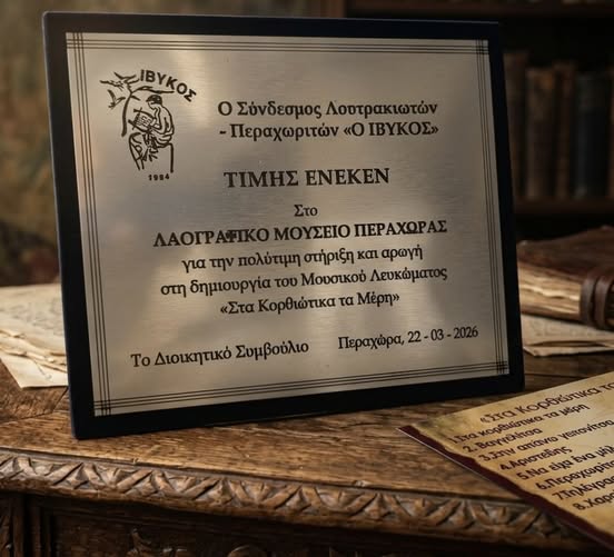 Μέσα σε μια ιδιαίτερα φορτισμένη συναισθηματικά ατμόσφαιρα, γεμάτη συγκίνηση αλλά και χαρά, πραγματοποιήθηκε η εκδήλωση παρουσίασης σημαντικών δράσεων με έντονο ιστορικό και πολιτιστικό αποτύπωμα από τον Σύνδεσμο Λουτρακιωτών – Περαχωριτών «ΙΒΥΚΟΣ», καθώς και η βράβευση των συντελεστών του μουσικού λευκώματος «Στα Κορθιώτικα τα μέρη», το οποίο τελεί υπό την αιγίδα του Υπουργείου Πολιτισμού.