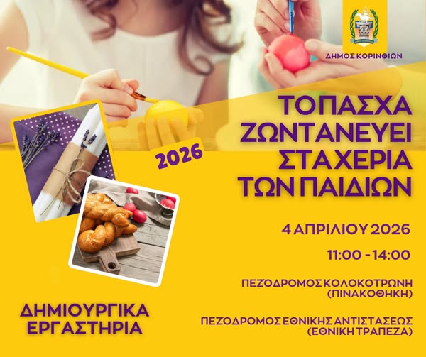 Ο Δήμος Κορινθίων προσκαλεί μικρούς και μεγάλους σε μια ξεχωριστή πασχαλινή εμπειρία, με ανοιχτά δημιουργικά εργαστήρια και δράσεις για παιδιά, που φέρνουν την παράδοση κοντά στη φαντασία και το παιχνίδι.