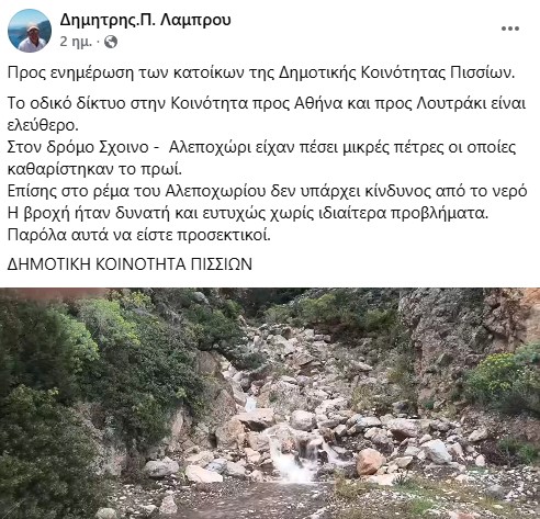 Αρχικά, σε ανακοίνωση προς τους κατοίκους, η Δημοτική Κοινότητα Πισσίων και ο Πρόεδρος Δημήτρης Λάμπρου ενημέρωσε ότι το οδικό δίκτυο προς Αθήνα και προς Λουτράκι είναι ελεύθερο, ενώ για τον δρόμο Σχίνου – Αλεποχωρίου ανέφερε ότι είχαν πέσει μικρές πέτρες, οι οποίες καθαρίστηκαν το πρωί. Παράλληλα, σημειώθηκε ότι δεν υπάρχει κίνδυνος από το ρέμα Αλεποχωρίου και ότι, παρότι η βροχή ήταν δυνατή, δεν προέκυψαν ιδιαίτερα προβλήματα, με σύσταση προς τους κατοίκους να είναι προσεκτικοί.
