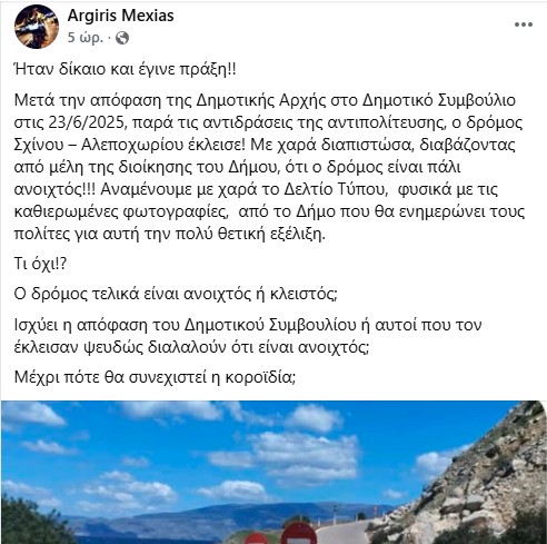 Το ζήτημα δεν είναι πολιτικό, είναι θέμα ασφάλειας ανθρώπων. Αν συμβεί ένα ατύχημα σε έναν δρόμο που επισήμως είναι κλειστός αλλά κάποιοι αφήνουν να εννοηθεί ότι είναι ανοιχτός, τότε οι ευθύνες θα είναι τεράστιες.