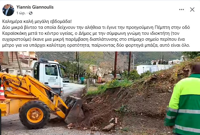 Δύο μικρά βίντεο τα οποία δείχνουν την αλήθεια τι έγινε την προηγούμενη Πέμπτη στην οδό Καραϊσκάκη μετά το Κέντρο Υγείας. Ο Δήμος με τη σύμφωνη γνώμη του ιδιοκτήτη (τον ευχαριστούμε) έκανε μια μικρή παρέμβαση διαπλάτυνσης στο επίμαχο σημείο περίπου ένα μέτρο για να υπάρχει καλύτερη ορατότητα, παίρνοντας δύο φορτηγά μπάζα. Αυτό είναι όλο.»