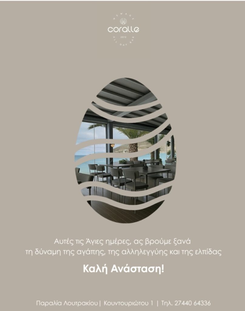 ΤΟΠΙΚΑΛουτράκι Πασχαλινές ευχές από το Coralle 7 Απριλίου 2026, 15:00 FacebookTwitterEmailCopy URLΤυπώνω - Advertisement - Η διεύθυνση και το προσωπικό του Coralle, σας εύχονται ολόψυχα Καλή Ανάσταση και Καλό Πάσχα! Παραλία Λουτρακίου | Κουντουριώτου 1 | 2744 064336 - Advertisement - ΕΤΙΚΕΤΕΣΕΥΧΕΣ ΠΑΣΧΑCORALLE ΑΦΗΣΤΕ ΜΙΑ ΑΠΑΝΤΗΣΗ Ακύρωση απάντησης Σχόλιο: εισάγετε το σχόλιό σας! Όνομα: παρακαλώ εισάγετε το όνομά σας εδώ Email: έχετε εισάγει εσφαλμένη διεύθυνση ηλεκτρονικού ταχυδρομείου! παρακαλώ εισάγετε εδώ την ηλεκτρονική σας διεύθυνση Ιστοσελίδα: αποθηκεύστε το όνομα, το ηλεκτρονικό ταχυδρομείο και τον ιστότοπό μου σε αυτό το πρόγραμμα περιήγησης για την επόμενη φορά που θα σχολιάσω. Δ Δείτε ακόμα Ελλάδα Ε.Κ.Κορίνθου: Ενημέρωση για την καταβολή δώρου Πάσχα 2026 Ελλάδα Ελληνική Αστυνομία: Χρήσιμες συμβουλές για ασφαλείς πασχαλινές αγορές Λουτράκι Πασχαλινές ευχές δημάρχου Λουτρακίου-Π-ΑΓ.Θ Γιώργου Γκιώνη ΑΡΘPΟΓΡΑΦΙΑ Αυτόν τον τόπο τον Διοικούν οι Συντεχνίες, του Χρήστου Ντούσικου Λουτράκι Πασχαλινές ευχές από τον Τουριστικό Οργανισμό Λουτρακίου Σχετικά άρθρα Λουτράκι Πασχαλινές ευχές δημάρχου Λουτρακίου-Π-ΑΓ.Θ Γιώργου Γκιώνη Λουτράκι Πασχαλινές ευχές από τον Τουριστικό Οργανισμό Λουτρακίου Λουτράκι Λουτράκι: Ιδανικός προορισμός για το Πάσχα 2026 ΤΟΠΙΚΑ Σοβαρή δυσλειτουργία της Παιδιατρικής Κλινικής στο Γενικό Νοσοκομείο Κορίνθου – Άμεση ανάγκη ενίσχυσης