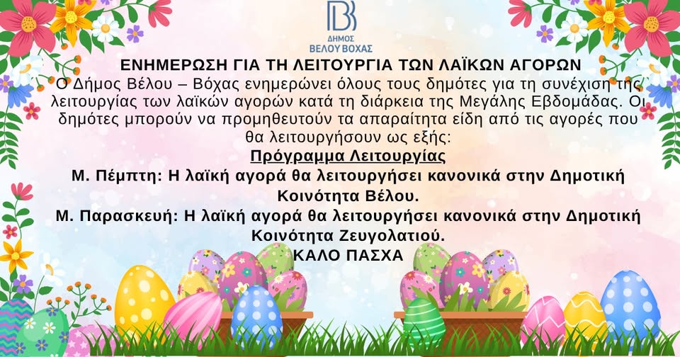 Ο Δήμος Βέλου – Βόχας ενημερώνει τους δημότες ότι οι λαϊκές αγορές θα συνεχίσουν κανονικά τη λειτουργία τους κατά τη διάρκεια της Μεγάλης Εβδομάδας.