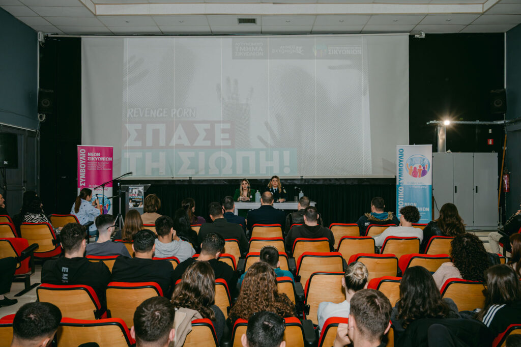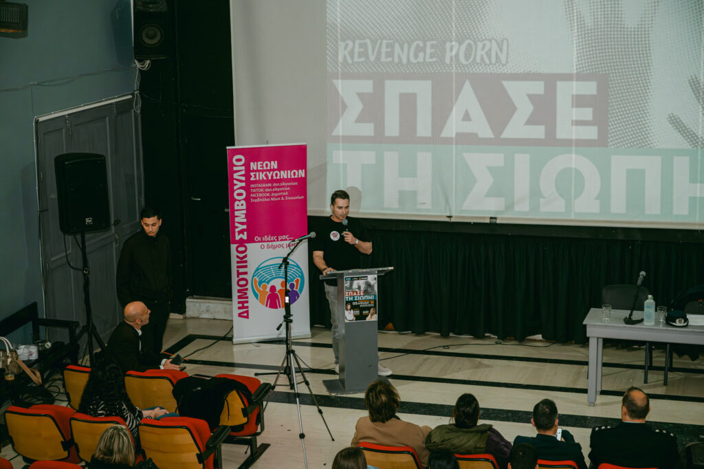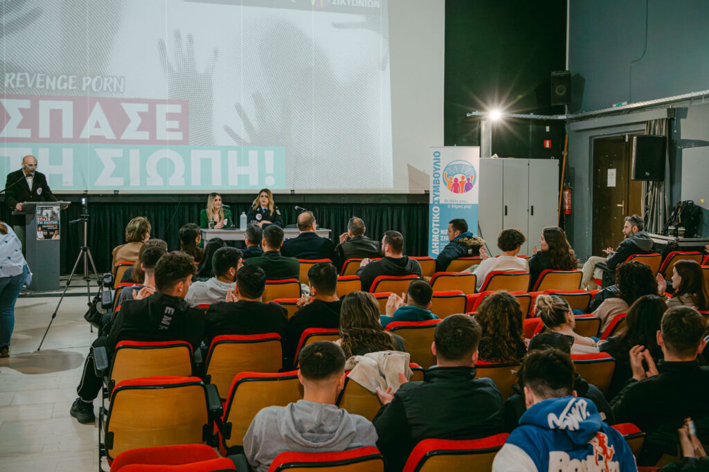 Η εκδήλωση «Σπάσε τη Σιωπή» που πραγματοποιήθηκε την Παρασκευή 3 Απριλίου στο Δημοτικό Θέατρο Κιάτου (Δημαρχείο), δημιούργησε τη δυναμική μιας αφετηρίας για μια οργανωμένη προσπάθεια αντιμετώπισης του revenge porn. Μέσα από τη συνδιοργάνωση του Δημοτικού Συμβουλίου Νέων Σικυωνίων, του Δήμου και του Αστυνομικού Τμήματος Σικυωνίων, διαμορφώθηκε ένα ασφαλές περιβάλλον διαλόγου για τους μαθητές των λυκείων της περιοχής. Οι έφηβοι μοιράστηκαν τους προβληματισμούς τους και κατανόησαν τη σημασία της ενεργού συμμετοχής στη διαμόρφωση μιας υπεύθυνης ψηφιακής κουλτούρας.
