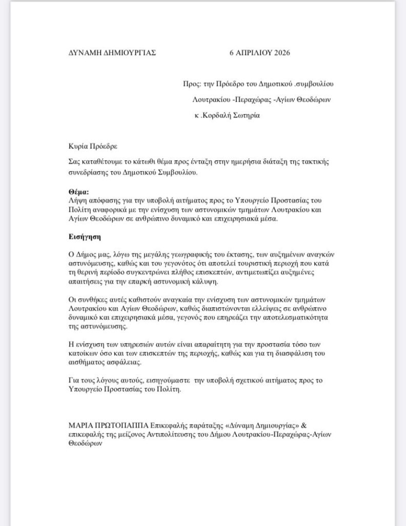 Λήψης απόφασης για στελέχωση του ΑΤ Λουτρακίου και σχετικό αίτημα στον αρμόδιο Υπουργό