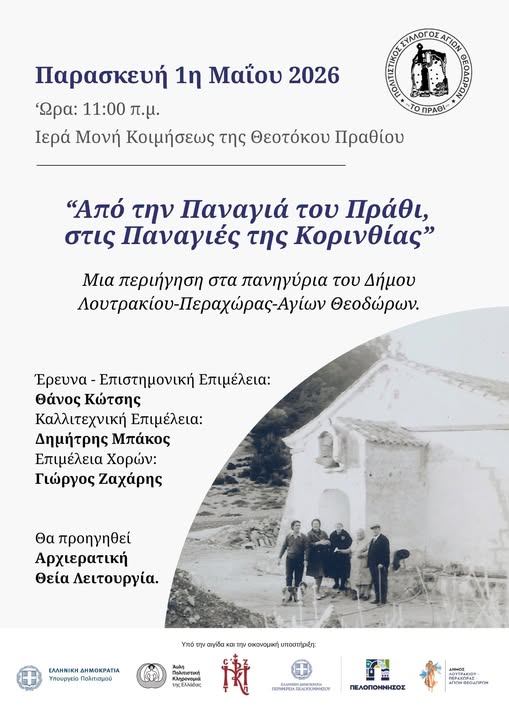 Την Παρασκευή 1η Μαΐου και ώρα 11:00 π.μ., στην Ιερά Μονή Κοιμήσεως της Θεοτόκου Πραθίου, σας προσκαλούμε στην εκδήλωσή μας: “Από την Παναγιά του Πράθι, στις Παναγιές της Κορινθίας”.