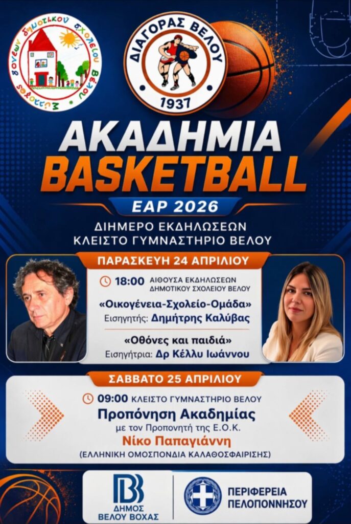 Ημερίδα διοργανώνει ο ΑΣ ΔΙΑΓΟΡΑΣ ΒΕΛΟΥ Basketball Academy, σε συνεργασία με τον Σύλλογο Γονέων και Κηδεμόνων του Δημοτικού Σχολείου του Βέλου την Παρασκευή 24 Απριλίου στις 6 η ώρα.