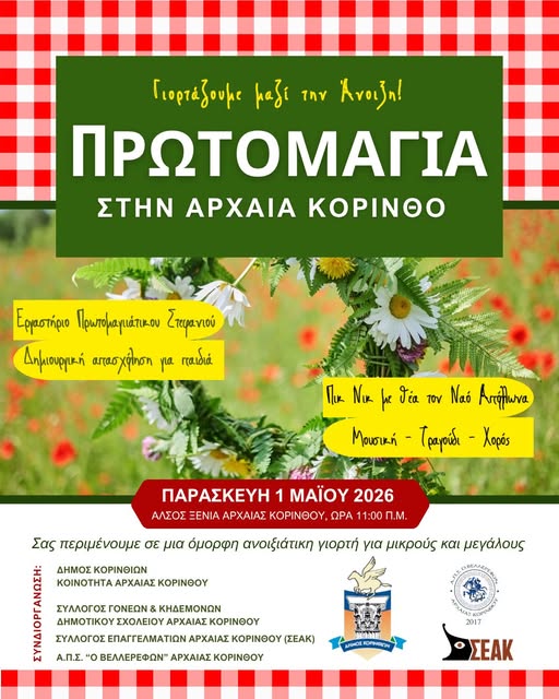 Ο Δήμος Κορινθίων, σε συνεργασία με την Κοινότητα Αρχαίας Κορίνθου, τον Σύλλογο Γονέων και Κηδεμόνων, τον ΣΕΑΚ (Σύλλογο Επαγγελματιών Αρχαίας Κορίνθου) και τον Α.Π.Σ. “Ο ΒΕΛΛΕΡΕΦΩΝ” Αρχαίας Κορίνθου, σας προσκαλεί να γιορτάσουμε μαζί την Πρωτομαγιά, στο Ξενία Αρχαίας Κορίνθου, σε μια όμορφη ανοιξιάτικη γιορτή για μικρούς και μεγάλους, γεμάτη λουλούδια, μουσική και δημιουργία.