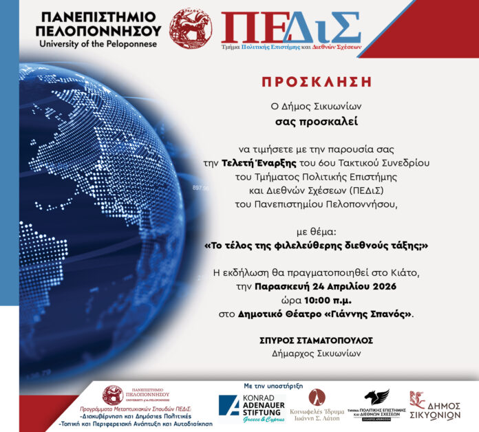 Δύο εικοσιτετράωρα απομένουν για την έναρξη του 6ου Τακτικού Συνεδρίου του Τμήματος Πολιτικής Επιστήμης και Διεθνών Σχέσεων (ΠΕΔιΣ) του Πανεπιστημίου Πελοποννήσου, το οποίο φιλοξενεί ο Δήμος Σικυωνίων στο Κέντρο Πολιτισμού «Γιάννης Σπανός». Την Παρασκευή 24 και το Σάββατο 25 Απριλίου 2026, το Κιάτο μετατρέπεται σε επίκεντρο του διεθνούς ακαδημαϊκού διαλόγου, με τη συμμετοχή περισσότερων από 130 διακεκριμένων επιστημόνων που θα αναλύσουν το μέλλον της παγκόσμιας τάξης πραγμάτων.