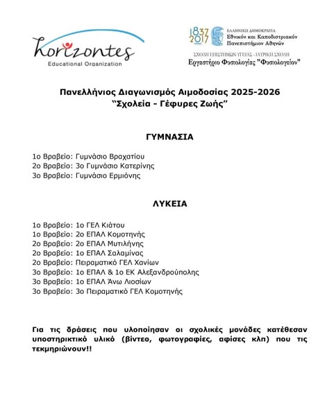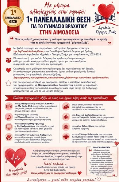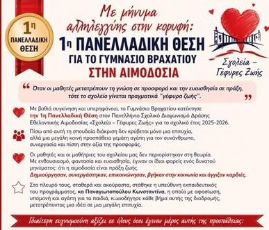 Με ιδιαίτερη χαρά και υπερηφάνεια, ο Σύλλογος Γονέων και Κηδεμόνων του Γυμνασίου Βραχατίου ανακοίνωσε τη σημαντική διάκριση μαθητών και μαθητριών του σχολείου, οι οποίοι κατέκτησαν την 1η Πανελλαδική θέση στον διαγωνισμό «Σχολεία – Γέφυρες Ζωής», που αφορά την εθελοντική αιμοδοσία.