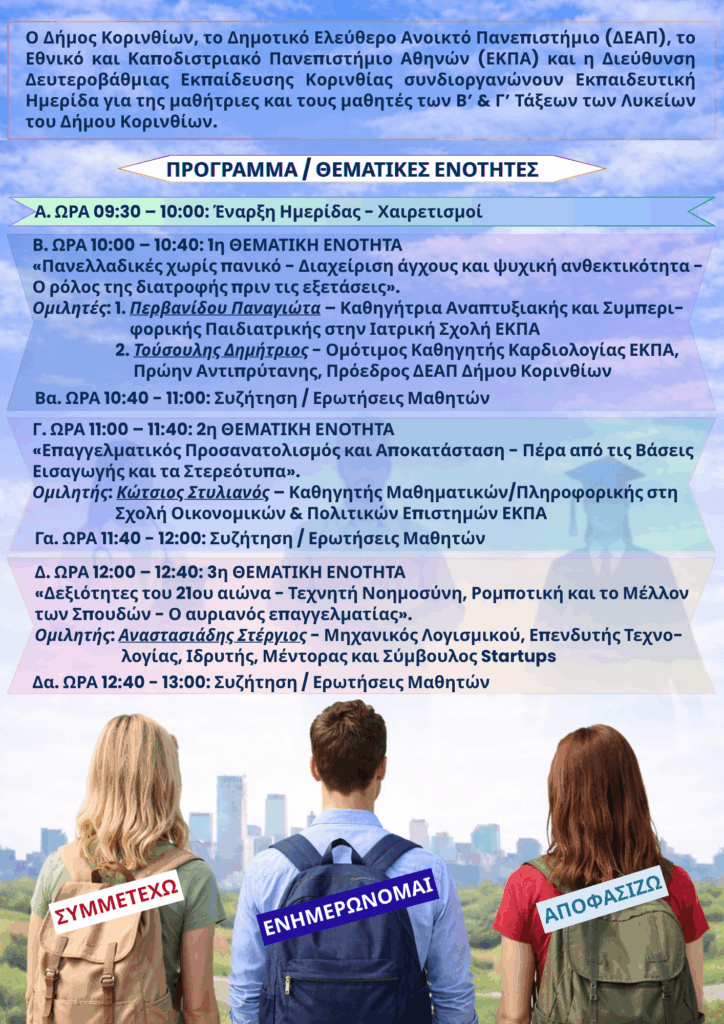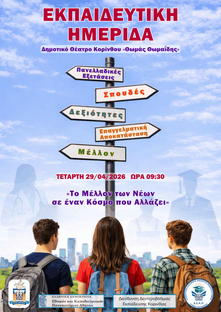 Ακριβώς σε αυτή την ανάγκη έρχεται να απαντήσει η ημερίδα για τον επαγγελματικό προσανατολισμό που συνδιοργανώνουν Τετάρτη 29/04/2026, από τις 09:30 το πρωί μέχρι τη 1:00 το μεσημέρι, ο Δήμος Κορινθίων, το Δημοτικό Ελεύθερο Ανοικτό Πανεπιστήμιο (ΔΕΑΠ), το Εθνικό και Καποδιστριακό Πανεπιστήμιο Αθηνών (ΕΚΠΑ) και η Διεύθυνση Δευτεροβάθμιας Εκπαίδευσης Κορινθίας.